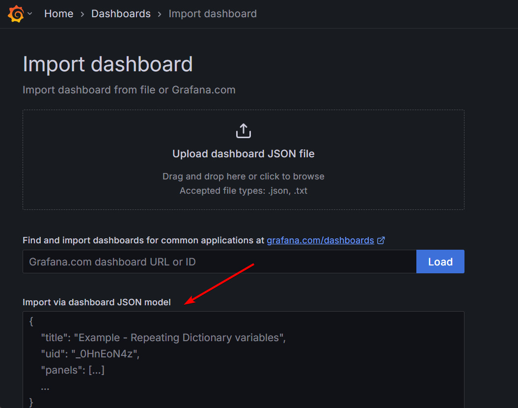 You can also use the Grafana Dashboard that has been created for TriliumNext - just take the JSON from grafana-dashboard.json and then import the dashboard, following these screenshots: