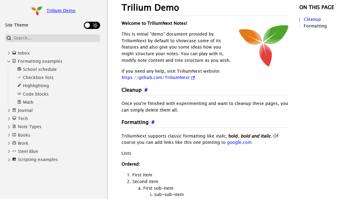 Trilium allows you to share selected notes as publicly accessible read-only documents. This feature is particularly useful for publishing content directly from your Trilium notes, making it accessible to others online.